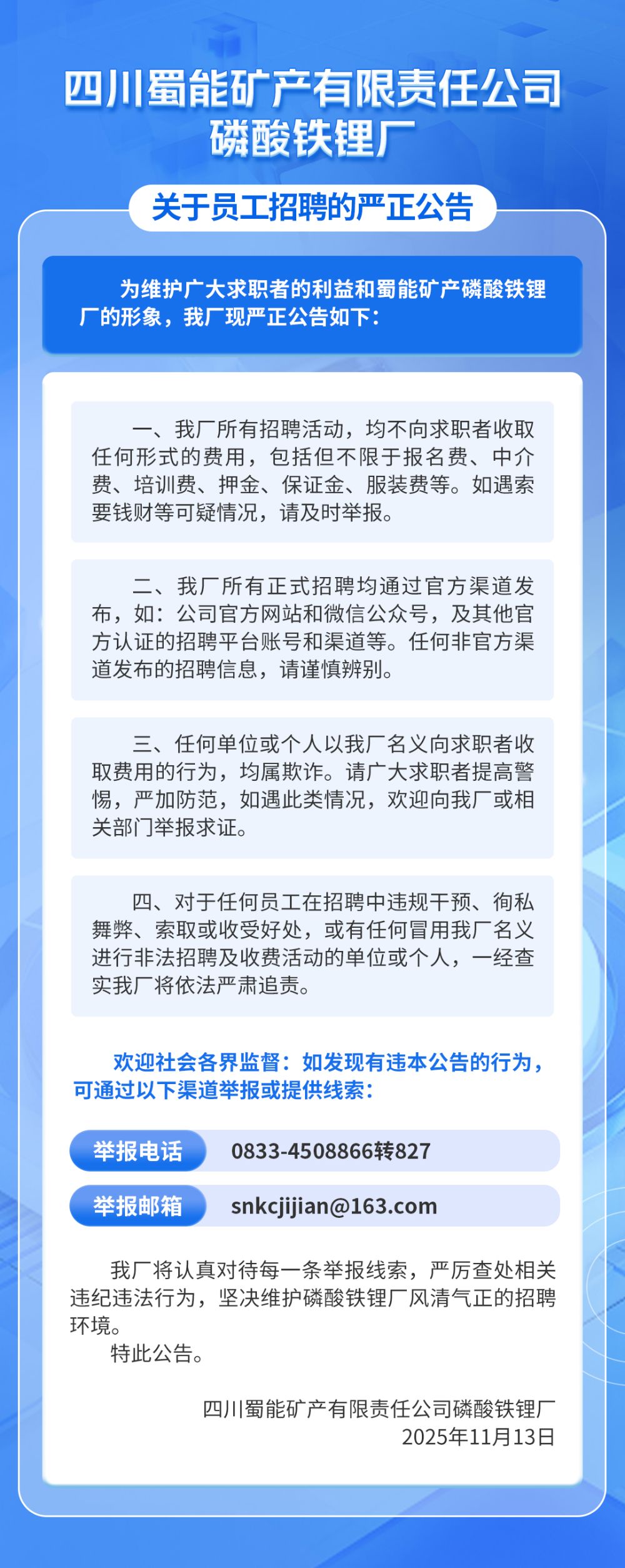海燕策略线路1磷酸铁锂厂关于员工招聘的严正公告