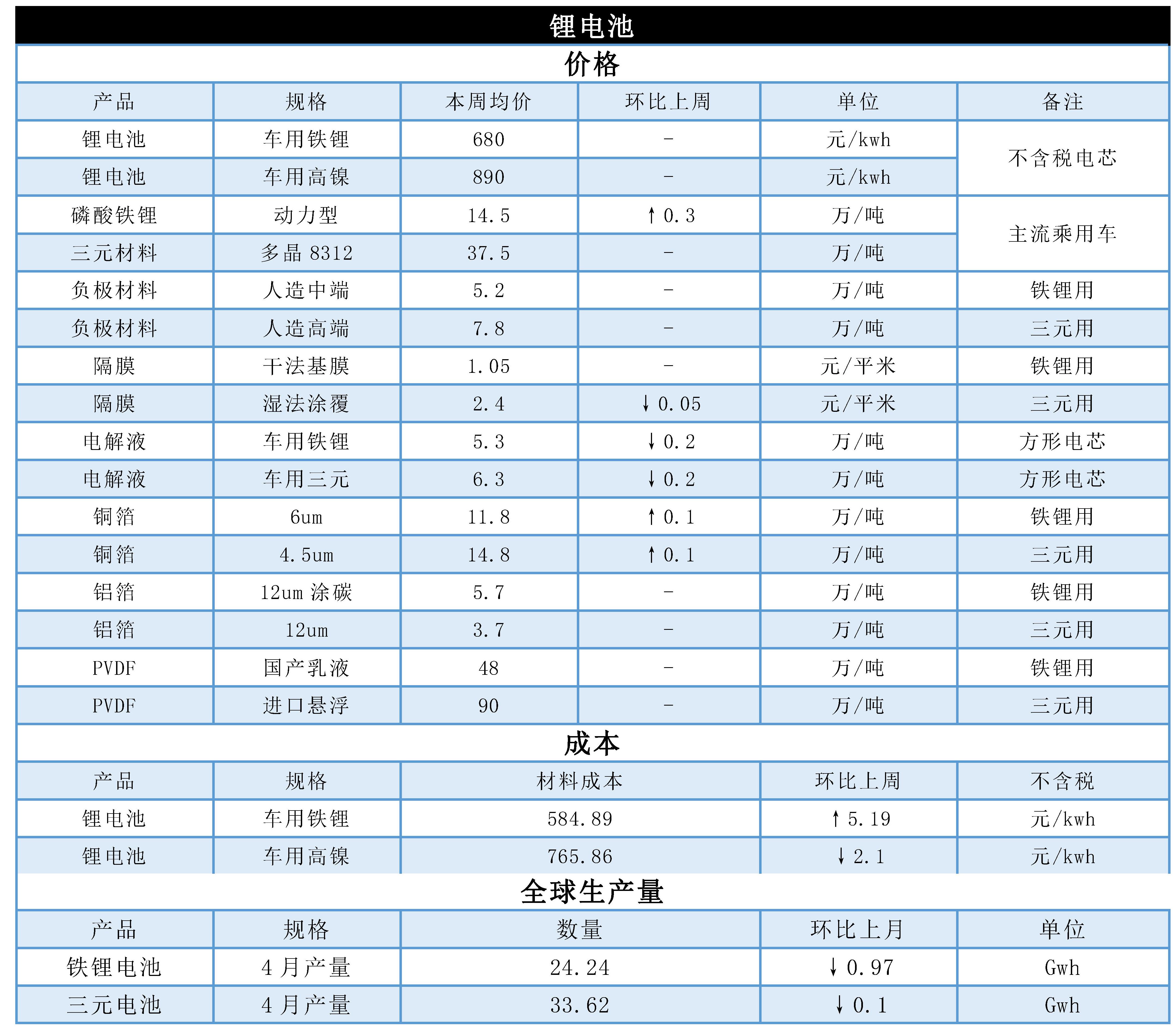 本周电池原料价格互有小幅的涨跌,综合成本变化不大。